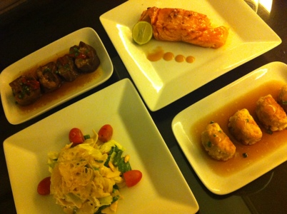 Seen here – Miso Salmon, pumpkin gyoza, baked eggplant & green bean, bamboo & lotus flower salad.